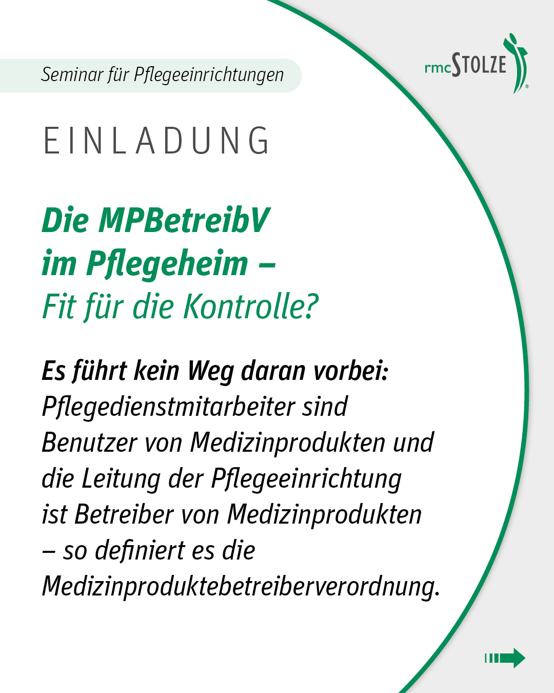 Die rmcStolze GmbH übernimmt die Umsetzung der Verordnung in allen administrativen und logistischen Bereichen. Sie stellt ein wichtiges Bindeglied zwischen Patienten, Ärzten, Pflegeeinrichtungen und Kostenträgern dar. Die rmcStolze GmbH erledigt die nötigen Vorgänge mit den Kostenträgern und wickelt die Versorgung des Patienten mit den verordneten Hilfsmitteln unter besonderer Berücksichtigung der intensiven Einweisung in die Bedienung ab. Die rmcStolze GmbH bietet dem Patienten größtmögliche Sicherheit durch Service, Wartung und vor allem einen